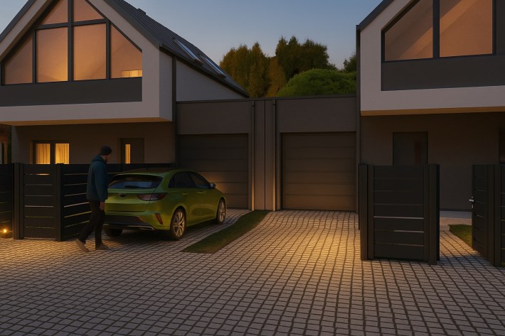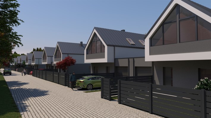 Każdy dom posiada garaż w bryle budynku, prywatny ogród oraz dodatkowe miejsce postojowe.