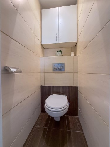 Łazienka i toaleta są w nowoczesnej kolorystyce, praktycznie urządzone.