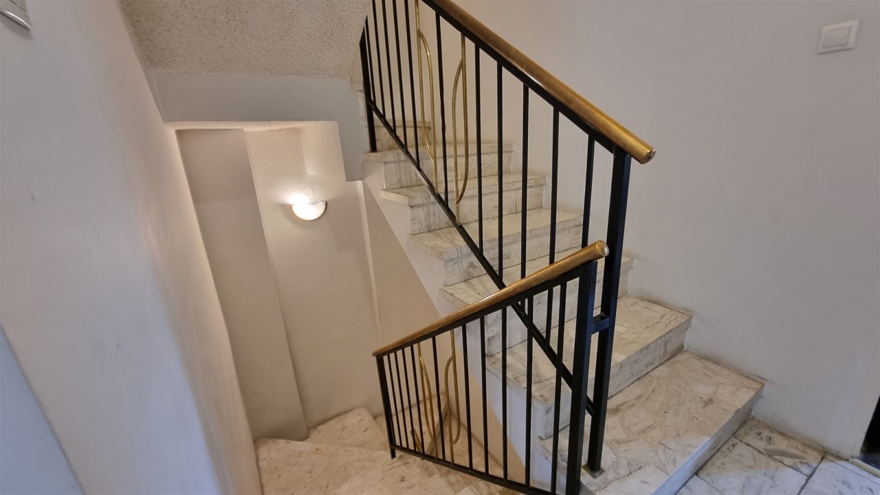 ELEGANCKA KLATKA SCHODOWA : schody betonowe, okładzina podłoga marmur, barierki metalowe