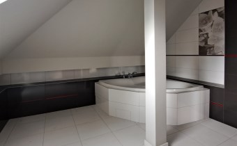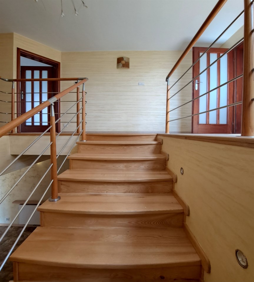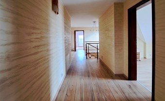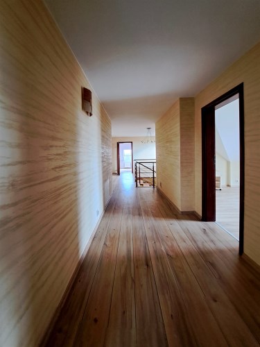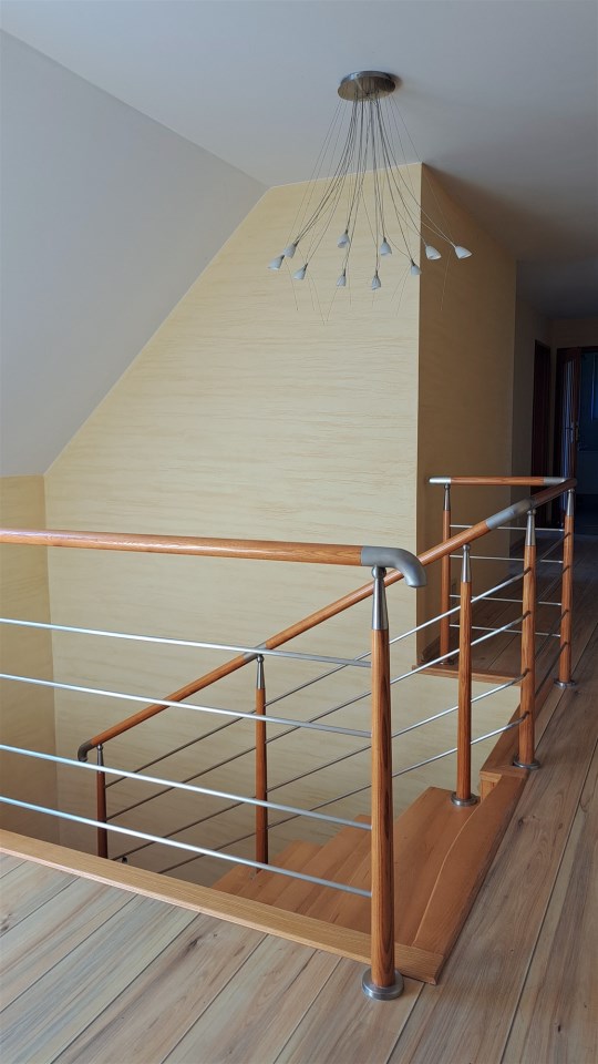 Kierując się schodami w górę znajdujemy się w holu kolejnej kondygnacji. Na piętrze znajdują się 4 pokoje, 2 garderoby, w tym jedną przynależną bezpośrednio do sypialni, 2 łazienki (z czego jedno z pomieszczeń stanowi pokój kąpielowy).