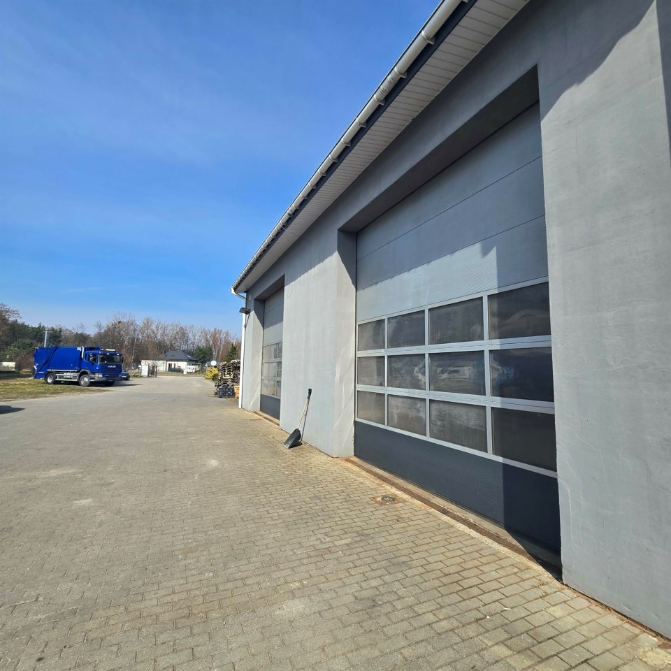 Hala z bramą wjazdową, pozwala na parkowanie dwóch samochodów jednocześnie.