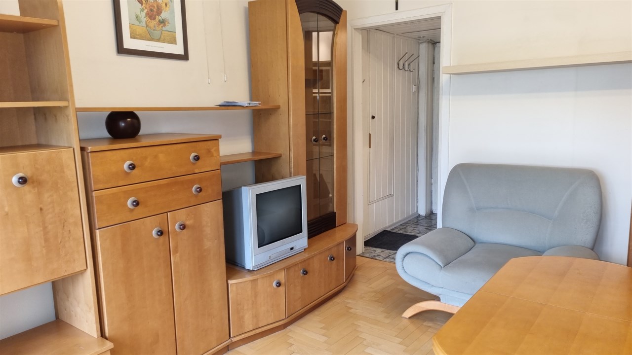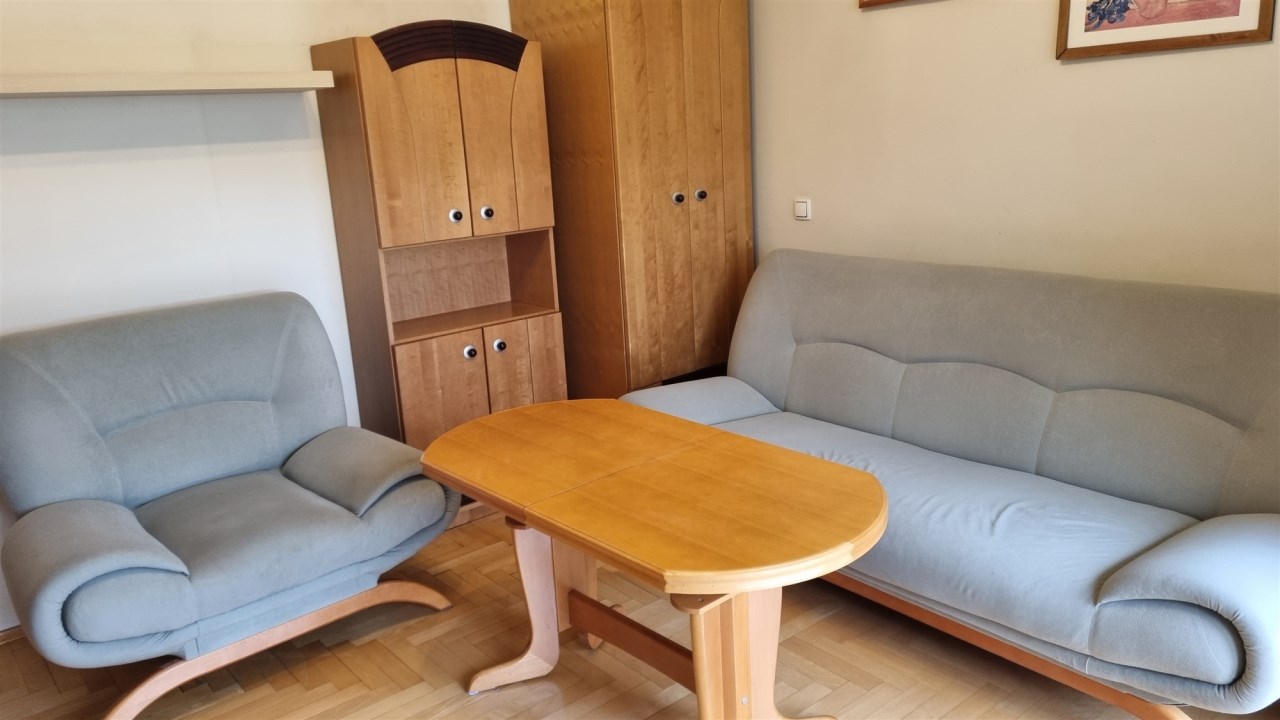 - POKÓJ: ściany: gładzie gipsowe malowane; podłoga: parkiet,  kanapa rozkładana, fotel, ława, biurko, segment, lodówka
