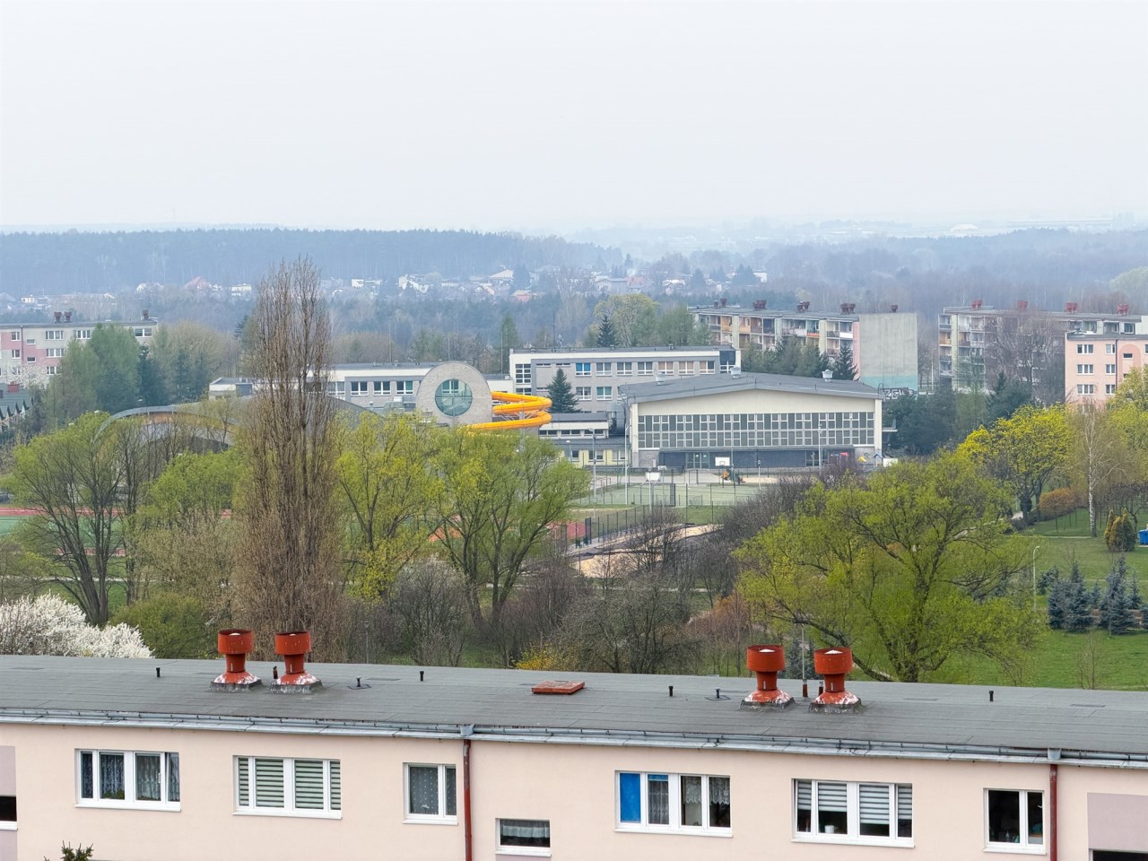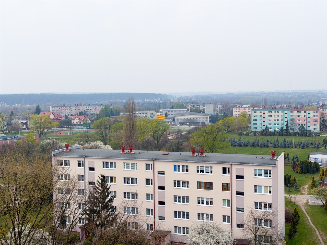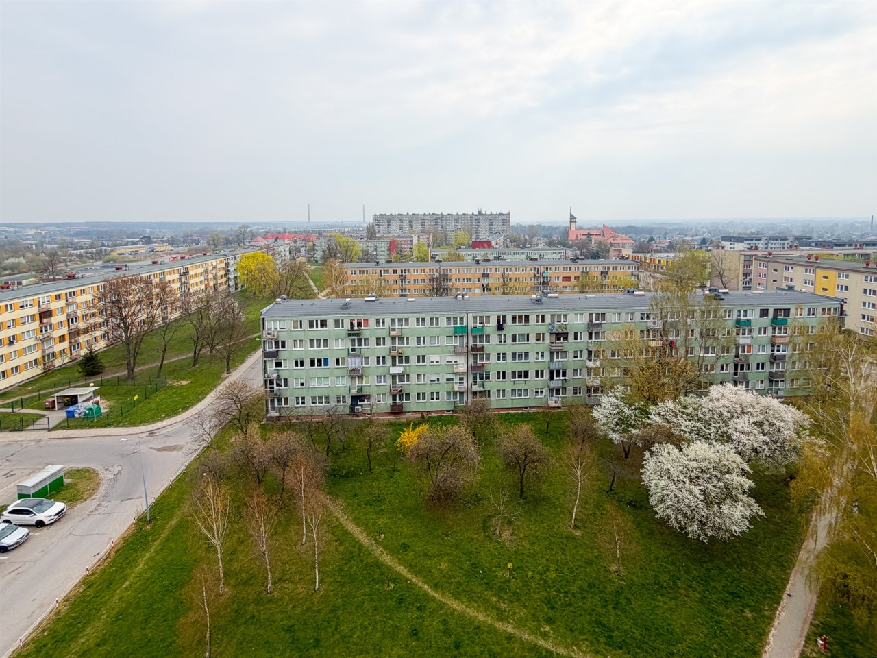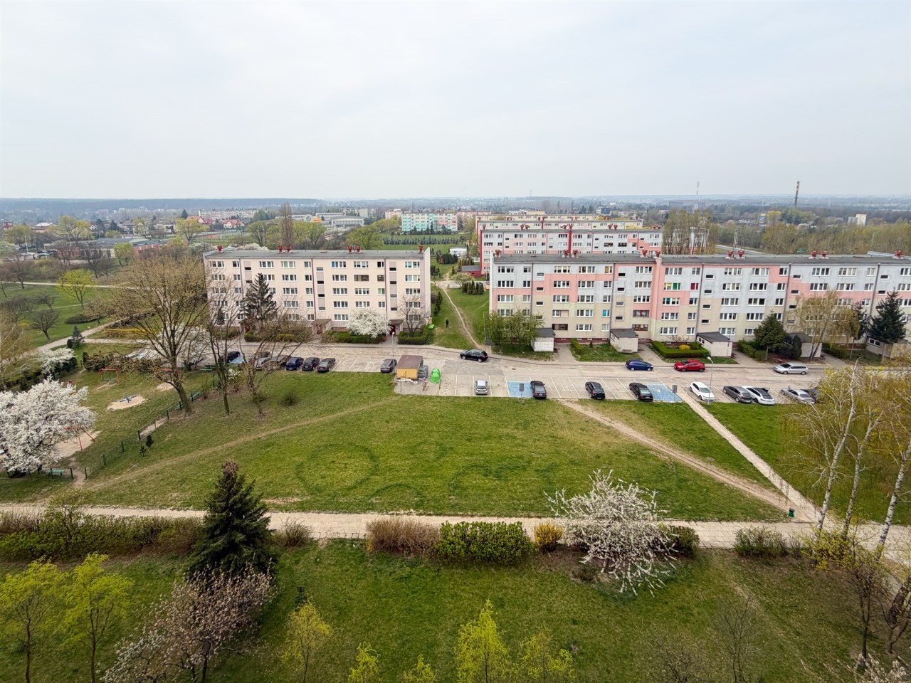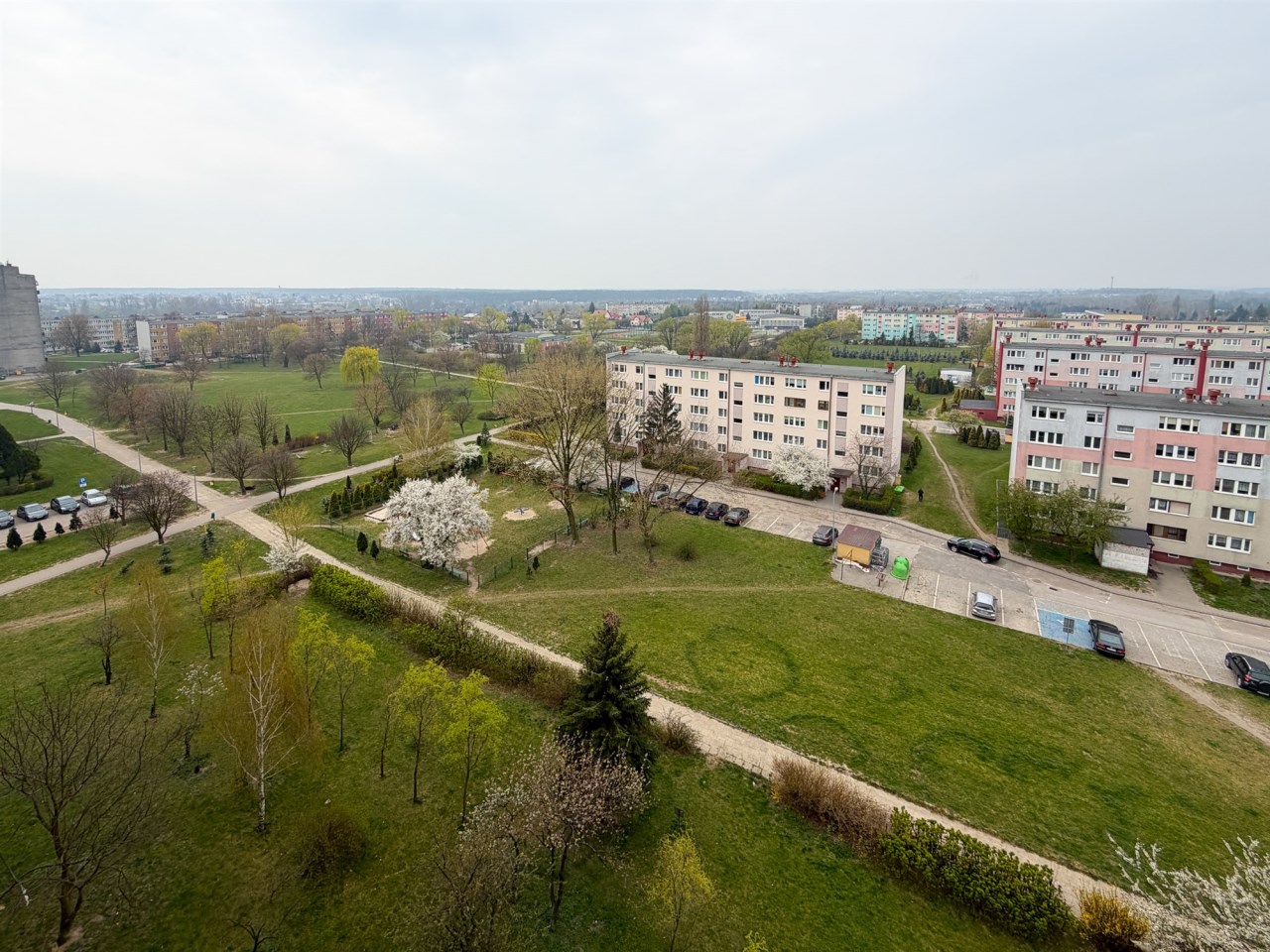 Okolica jest wyjątkowo cicha i zielona, a widok z mieszkania rozciąga się na osiedle.