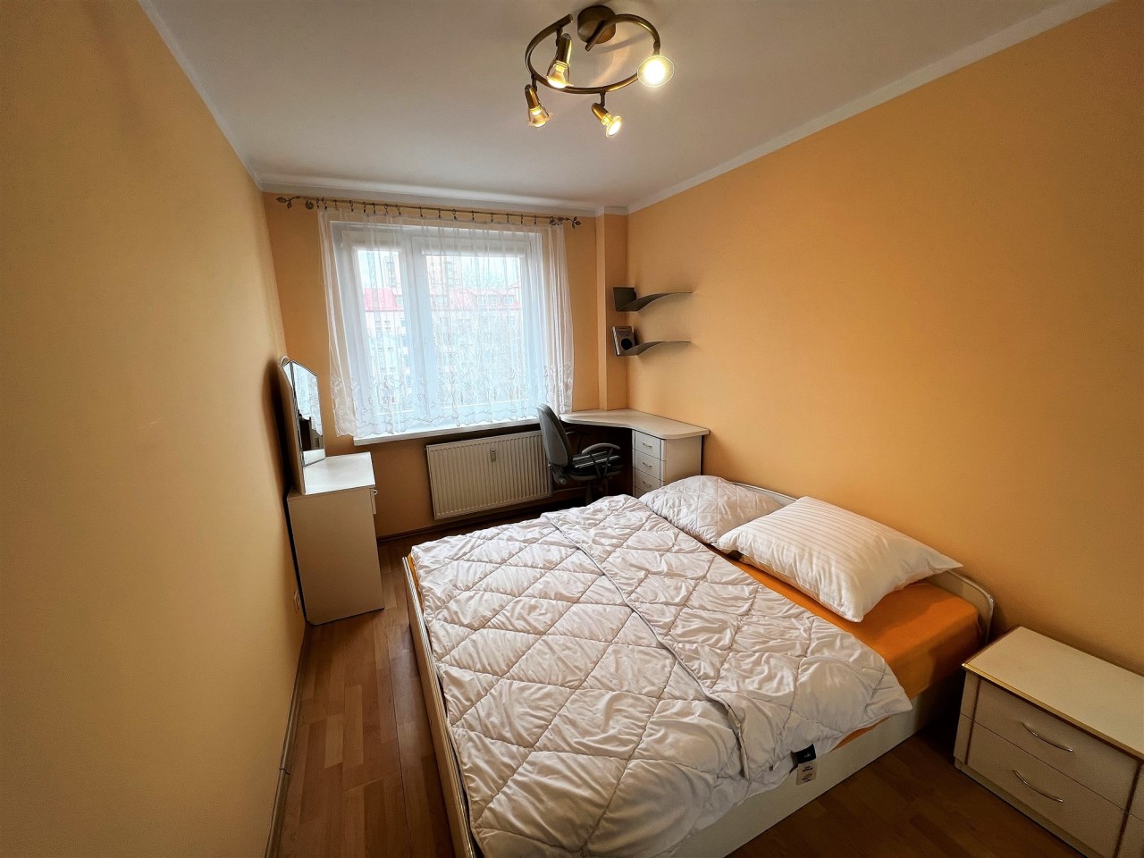 - SYPIALNIA: gładzie, łóżko podwójne, szafka nocna, toaletka, biurko + fotel obrotowy, firany, szafa garderoba w zabudowie,