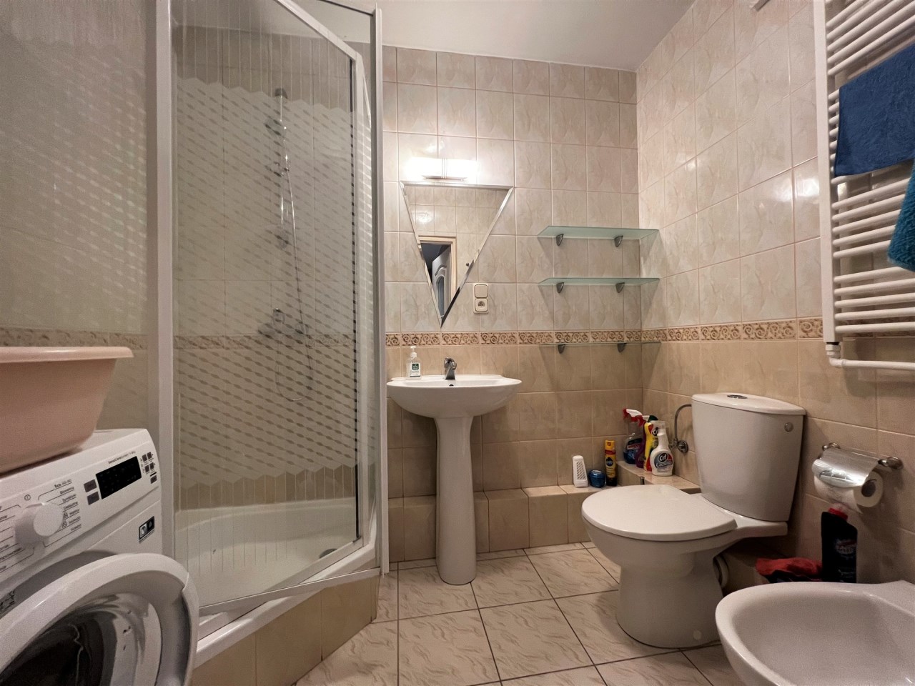 - ŁAZIENKA Z WC: glazura, terakota, kabina prysznicowa, nowa pralka, sedes, bidet, umywalka z nogą, półki szklane,